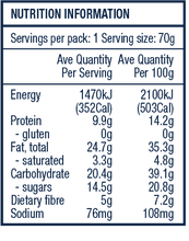 Ingredients: Nuts (34%) [cashew nuts, peanuts, almonds], Seeds [sesame, pumpkin, sunflower, ground linseed], Dates, Coconut Sugar, Manuka Blend Honey, Hi-oleic Cold-Pressed Sunflower Oil, Puffed Quinoa, Cinnamon, Salt